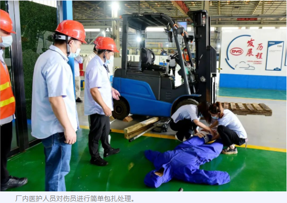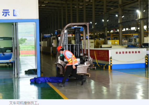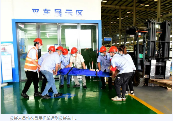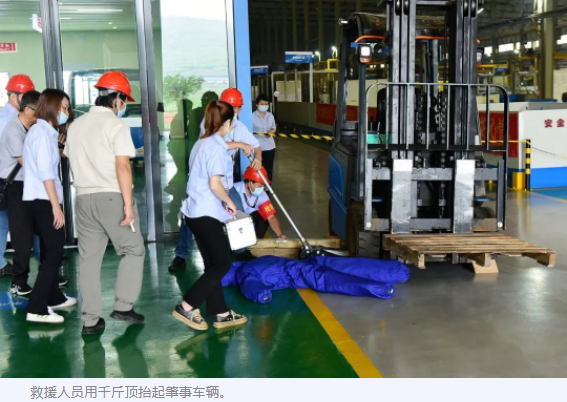 別擔(dān)心!這是韶關(guān)市比亞迪實業(yè)有限公司正在開展叉車應(yīng)急救援演練活動,現(xiàn)場模擬一名叉車司機在駕駛叉車時違章操作,導(dǎo)致一名員工被撞倒,隨后立即啟動公司救援預(yù)案采取的一系列措施的情境。